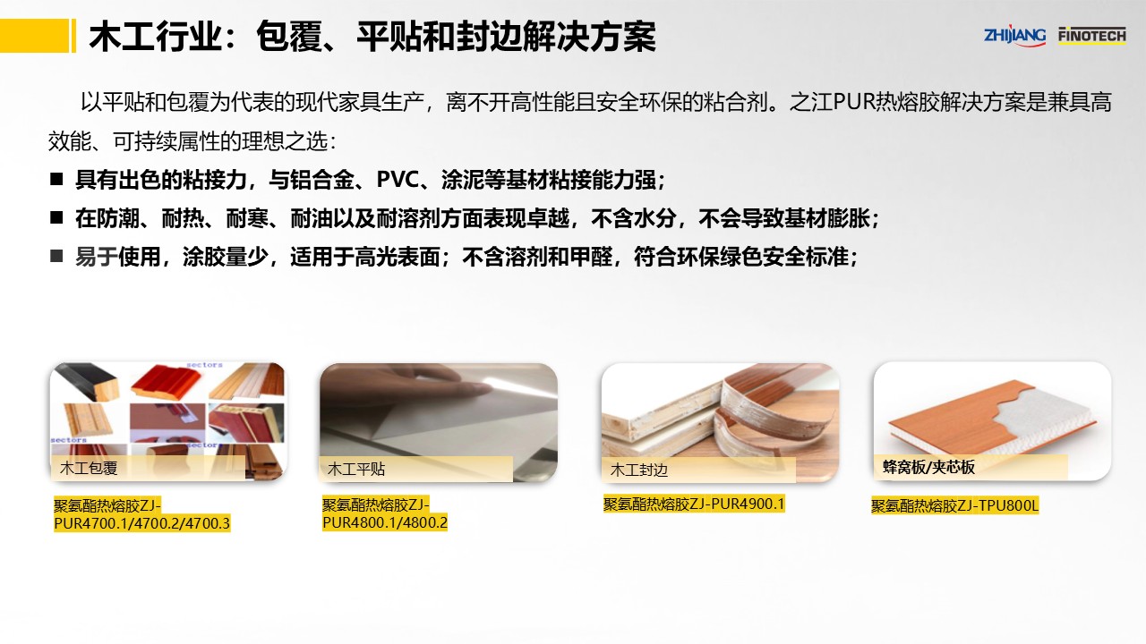 之江公司立足于中國膠粘劑行業領軍企業和有機硅膠、聚氨酯、環氧等專業膠粘劑的創新和產業化優勢,具有國家高新技術企業和國家級企業技術中心資質,依靠國家級CNAS實驗室以及國家級博士后科研工作站,并有國際專家助力,可為木工行業提供包覆、平貼、封邊應用的聚氨酯熱熔膠粘接解決方案,推出了如下產品: